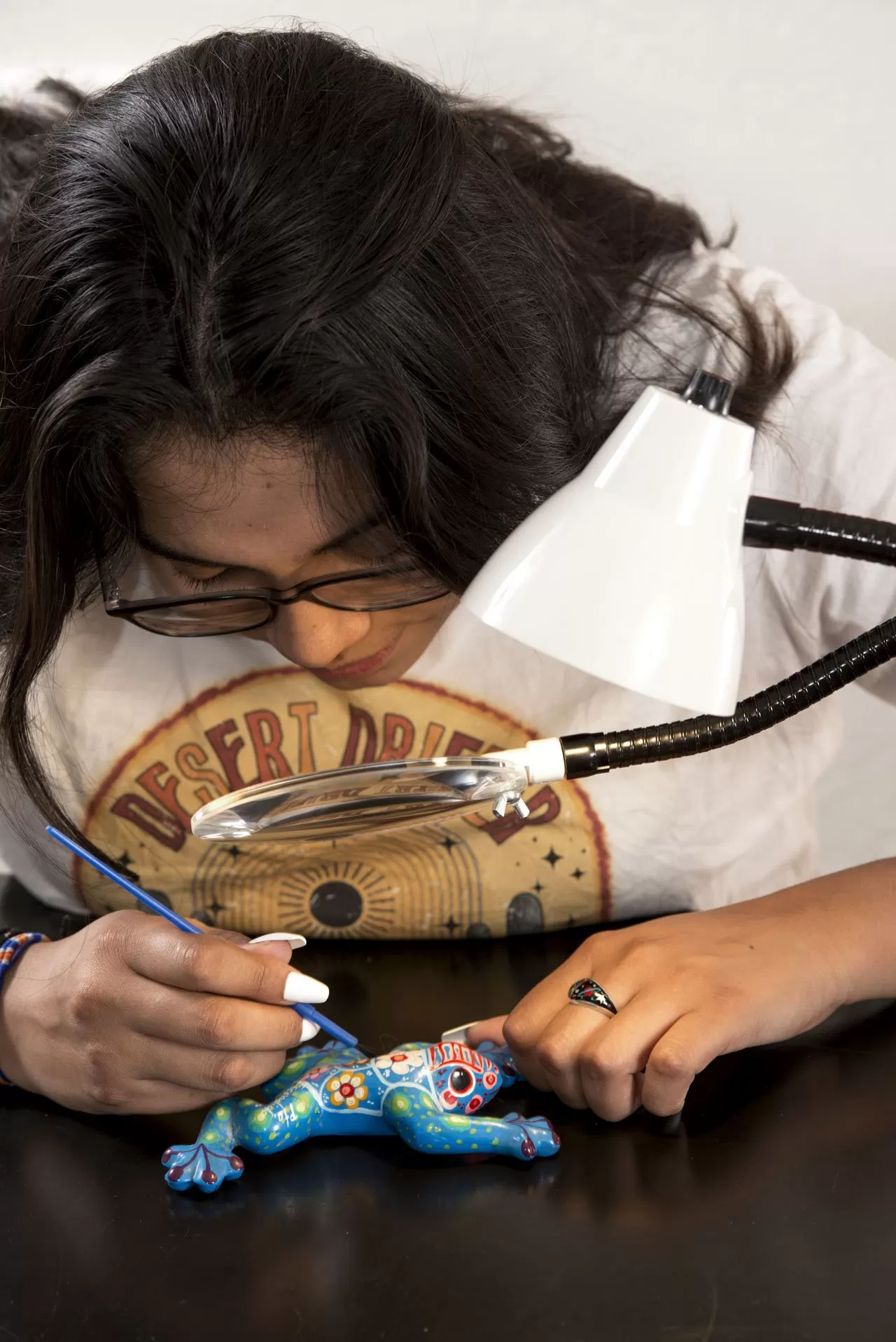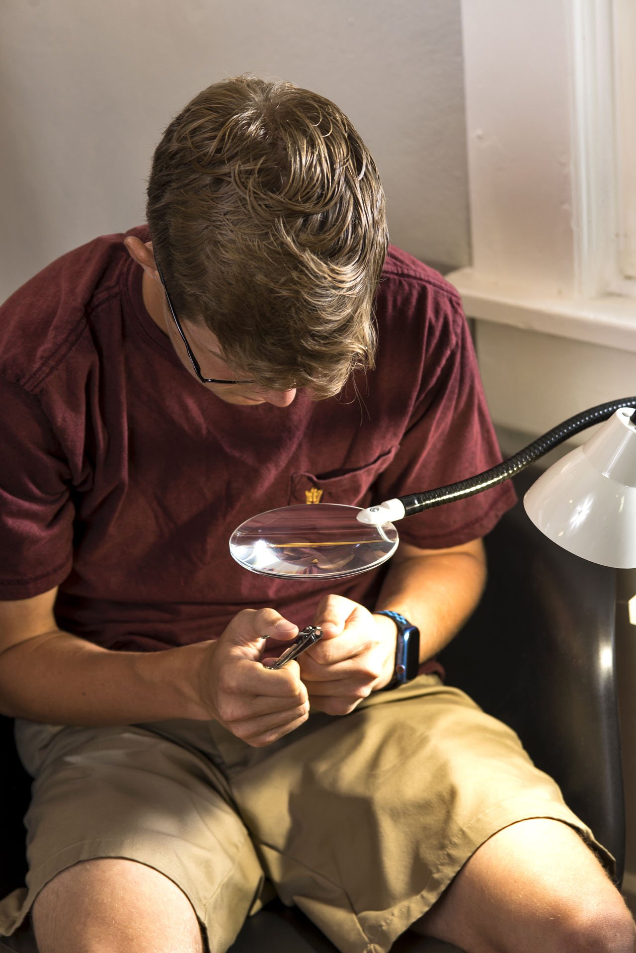 Our double-arm magnifying floor lamp adjusts from 30” to 60” giving maximum versatility for different height and workspace needs. The lamp is mounted on a 14” flexible gooseneck arm and the BigEye 5” distortion-free optical quality lens is mounted on a separate 18” flexible gooseneck arm. The rolling base measures 23" x 23", and 31/4" tall. It has 4 smooth-gliding caster wheels for easy of movement.